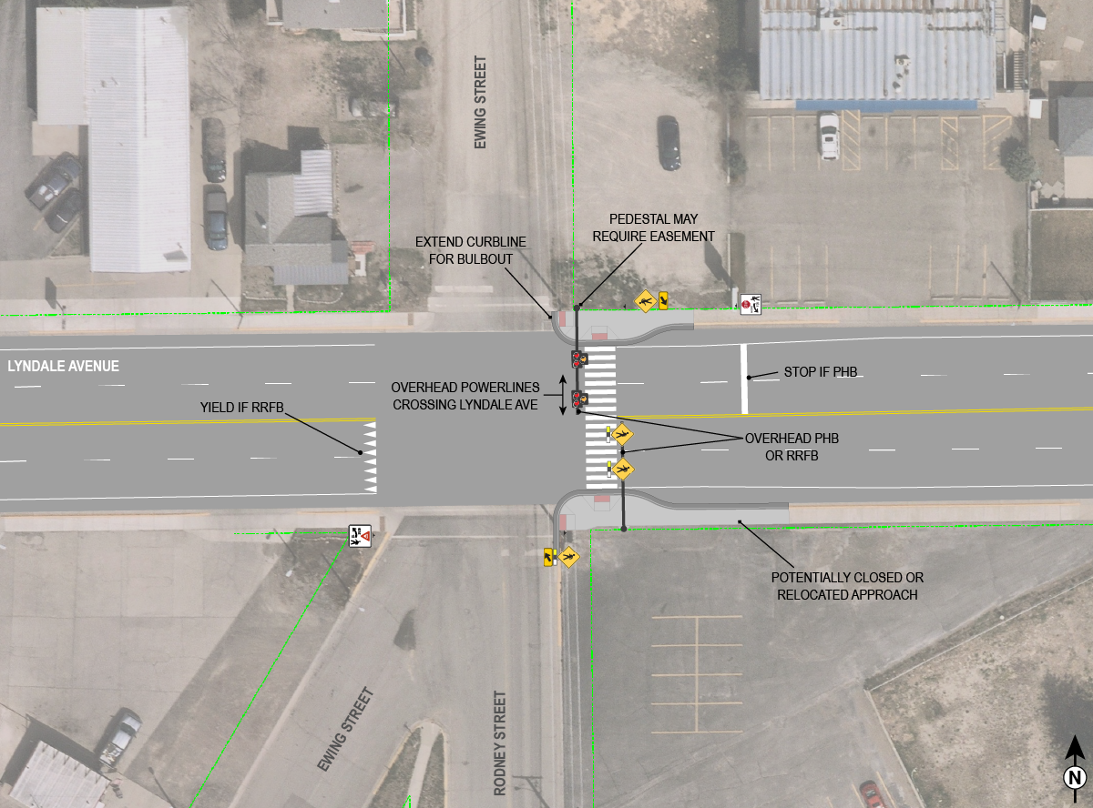 In addition to geometric design elements, the study also analyzed traffic control treatments, specifically Pedestrian Hybrid Beacons (PHBs) and Rectangular Rapid Flashing Beacons (RRFBs), to determine their suitability for each proposed crossing configuration.