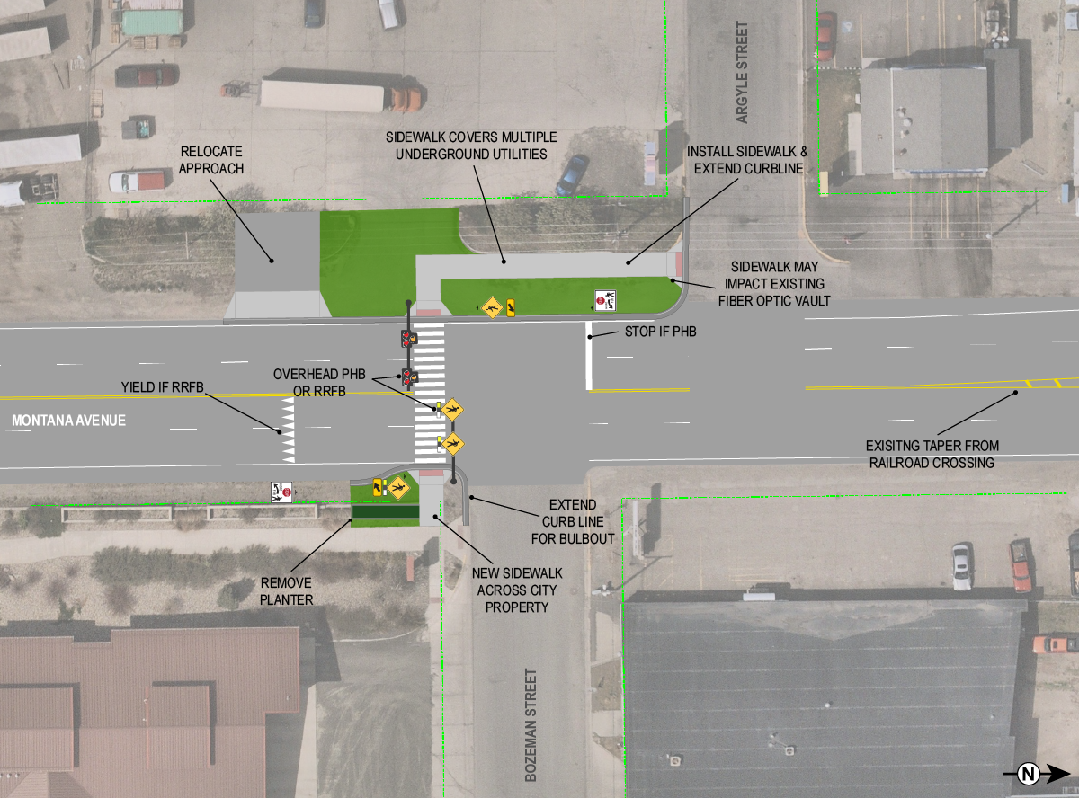 RPA conducted a preliminary engineering study to identify and evaluate pedestrian crossing improvements aimed at enhancing non-motorized access and connectivity, with a particular emphasis on supporting access to the Centennial Trail. The study focused on two key crossing locations: Lyndale Avenue at Ewing Street and Montana Avenue at Bozeman Street. Both locations are situated on high-traffic, multi-lane roadways that currently serve as significant barriers to safe and convenient pedestrian movement.